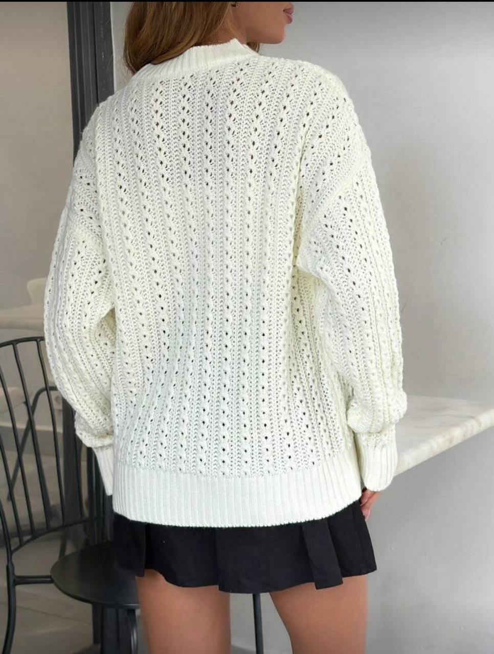 Le Conseil Mode : Portez ce pull ajouré avec une jupe plissée noire (comme sur la photo) ou un jean clair pour un style « Clean Girl » ultra-tendance.