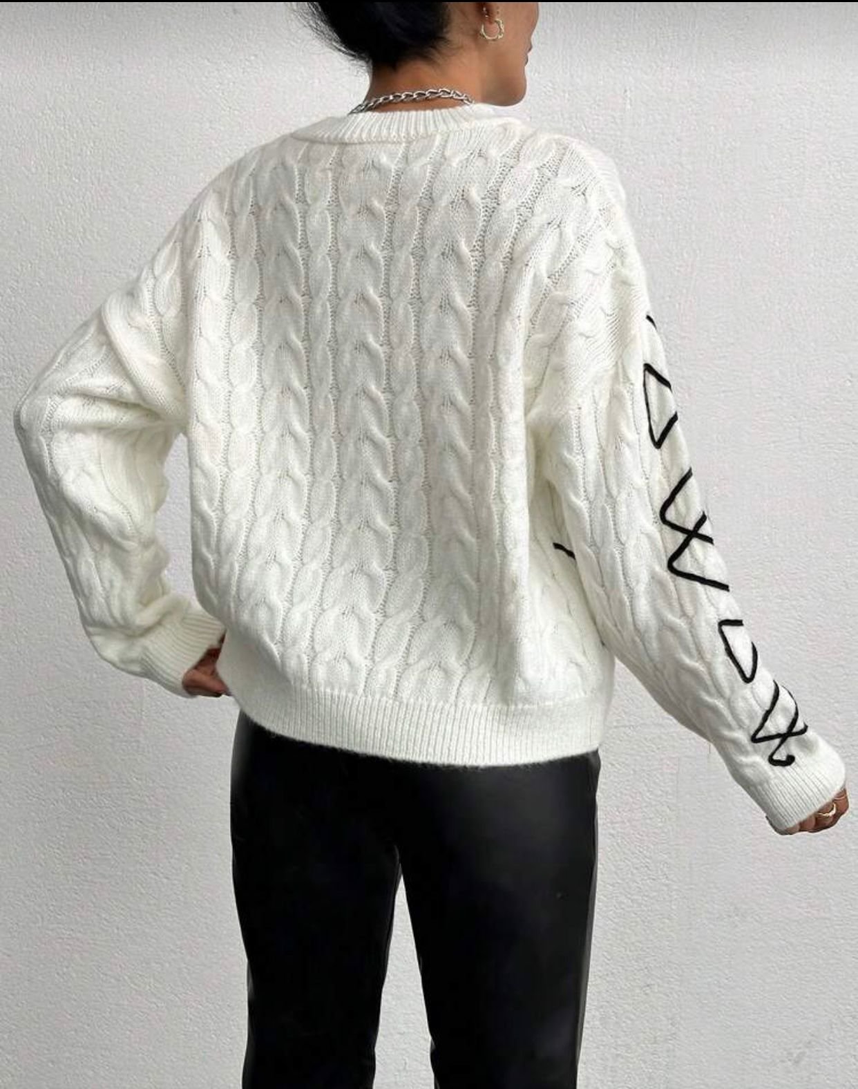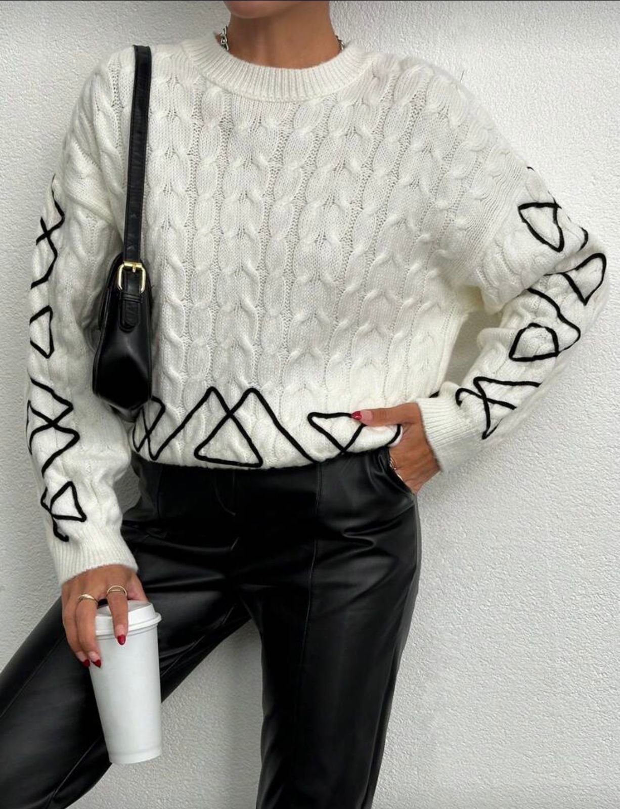 Le Style : Ce pull brodé se distingue par ses motifs géométriques noirs brodés sur les manches et le bas du vêtement, créant un contraste chic et artistique.